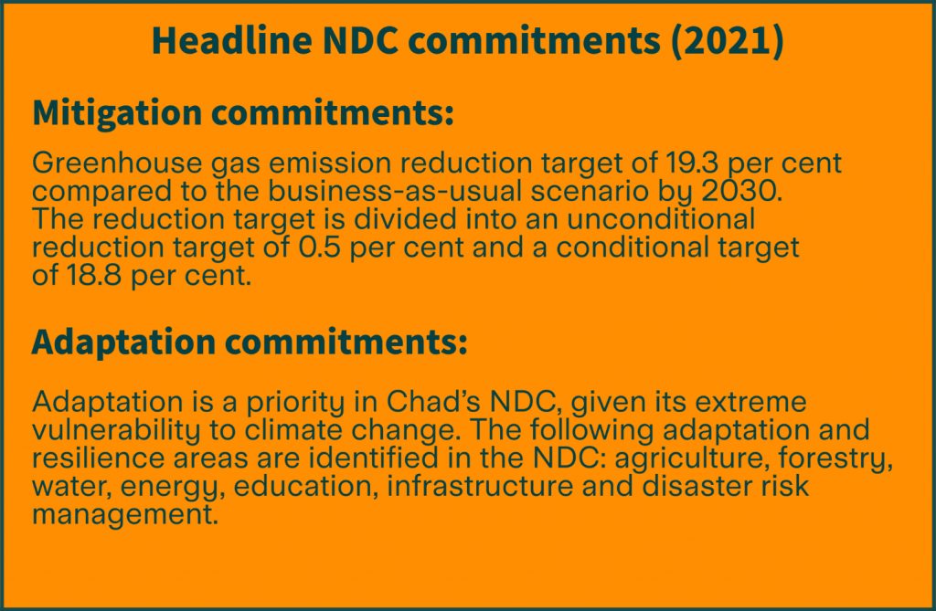 Chad is one of the world’s most vulnerable countries to the adverse effects of climate change. While the country is not historically responsible for greenhouse gas emissions that cause global climate change, it has made both international and national commitments to address climate change and enhance the country’s resilience. Since ratifying the United Nations Framework Convention on Climate Change (UNFCCC) in 1993 and the Kyoto protocol in 2009, Chad has made steady progress on its climate action.