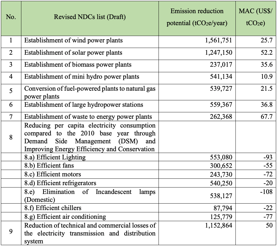 Above: Table showing Sri Lanka’s nine energy NDCs and the marginal abatement costs for potential emission reduction. Data as at May 2020
