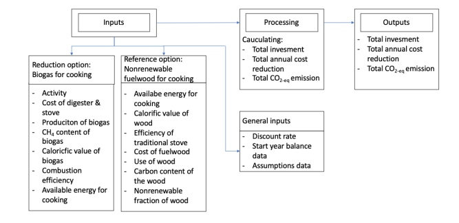 Above: A graphic overview of an example of the inputs that countries can provide in GACMO to achieve a set of outputs. This example covers the increased use of biogas for cooking.