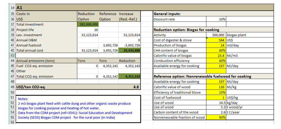 Above: Screenshot of GACMO output related to Viet Nam’s plans to increase the use of biogas as a greenhouse gas emission reduction measure. The figures highlighted in green show the total investment required, the total annual cost, and the total CO2e emissions reduced. Figures highlighted in yellow indicate those entries that are provided as a standard option in GACMO, but can be adjusted by the country in question.