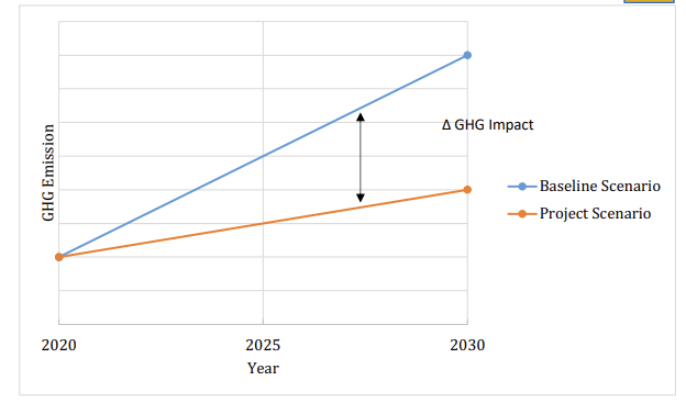 Above: Graph showing Sri Lanka’s projected decrease in greenhouse gas emissions (Project Scenario), compared to business as usual (Baseline Scenario), following assessment with GACMO.